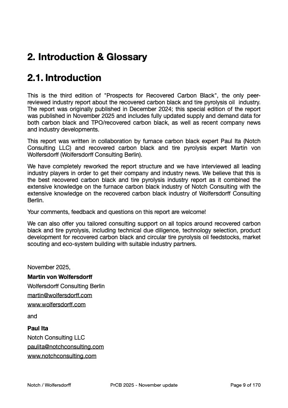 Prospects for recovered Carbon Black is the ultimate peer-reviewed industry reference report about the recovered carbon black and tire pyrolysis industry. The report was written in collaboration by the carbon black experts Paul Ita (Notch Consulting, LLC ) and Martin von Wolfersdorff (Wolfersdorff Consulting Berlin).